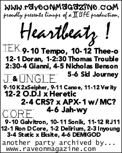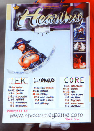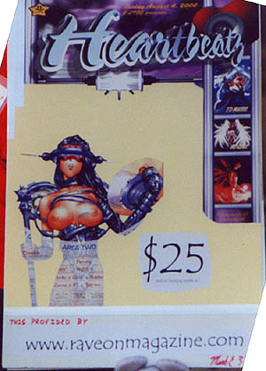 I use www.ravelinks.com to decide what parties the Rave On Crew is going to cover. I do not collect rave fliers or posters. I do not accept fliers or posters, no matter how much a promoter wants me to "just take it." I have no use for them whatsoever. However, I was shocked when I saw the Heartbeatz poster at Super Raver. On a limited budget, the 2 Life crew had created the best poster of any party to date. It is not just dope, or even doper, but dopest. I have over 20 of them, and plan use them all to decorate the bedroom of my new apartment. I admit that I wanted to go to this party because the poster was so much better than anything the big budget production companies could come up with. (Just to save us both time, let's pretend that I wrote about how great the poster was for the next 3 pages...) So, now that I have talked about how great the Hearbeatz poster is for 3 pages, maybe I should tell you how the party went... ![]() As is usual at the Masterdome, inside was Trance all night.