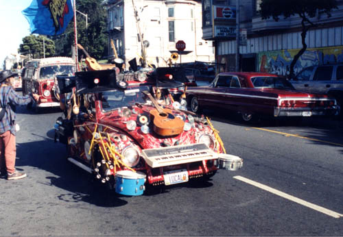 Out of nowhere, a parade of freeky cars rolls down the street,